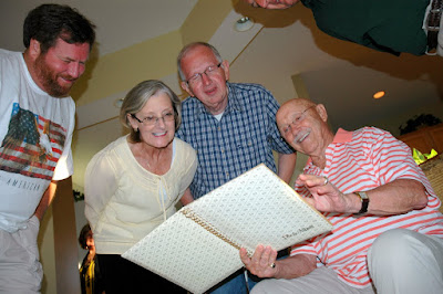Eighty years of living were celebrated across the way tonight at our neighbor Joe Daly's birthday party. Friends, family and neighbors enjoyed cake and ice cream with this California transplant who married a Minnesota girl and retired here 10 years ago. He's become a Twins fan, persistent rose gardener and neighborhood favorite. His San Francisco family members flew here to join others for a birthday dinner at the clubhouse tonight, then returned to the cul de sac to be greeted by more well-wishers.Above, Joe paged through an album documenting his early years as a golden gloves boxer, merchant marine, grocer and union organizer. His pop worked on the Golden Gate bridge. He's joined in the photo by neighbors Bud Osmundson and Mary and John Gerken.